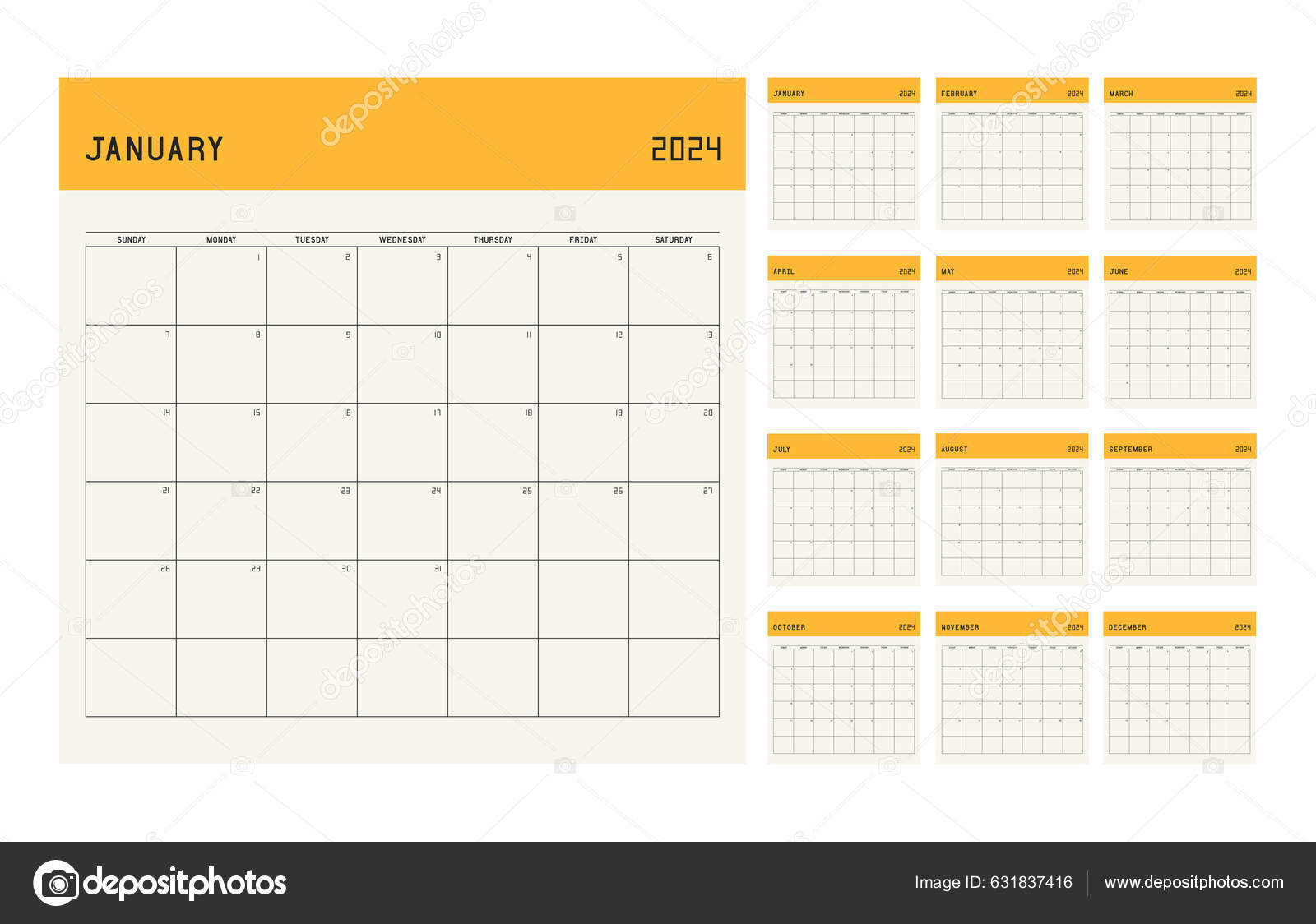 Calendar Planner Template 2024 Year Week Starts Sunday Notes Stock
